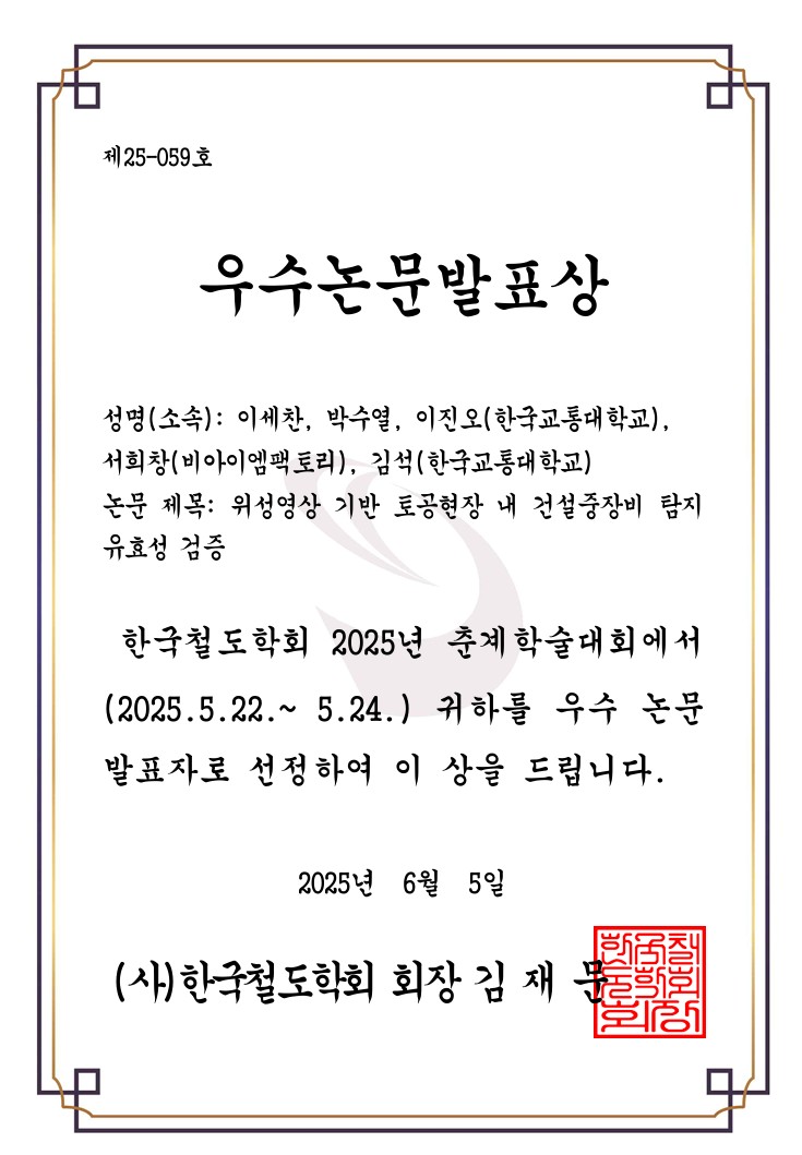 철도건설관리연구실은 2025 철도학회 춘계학술대회에서 우수논문상을 수상했습니다!