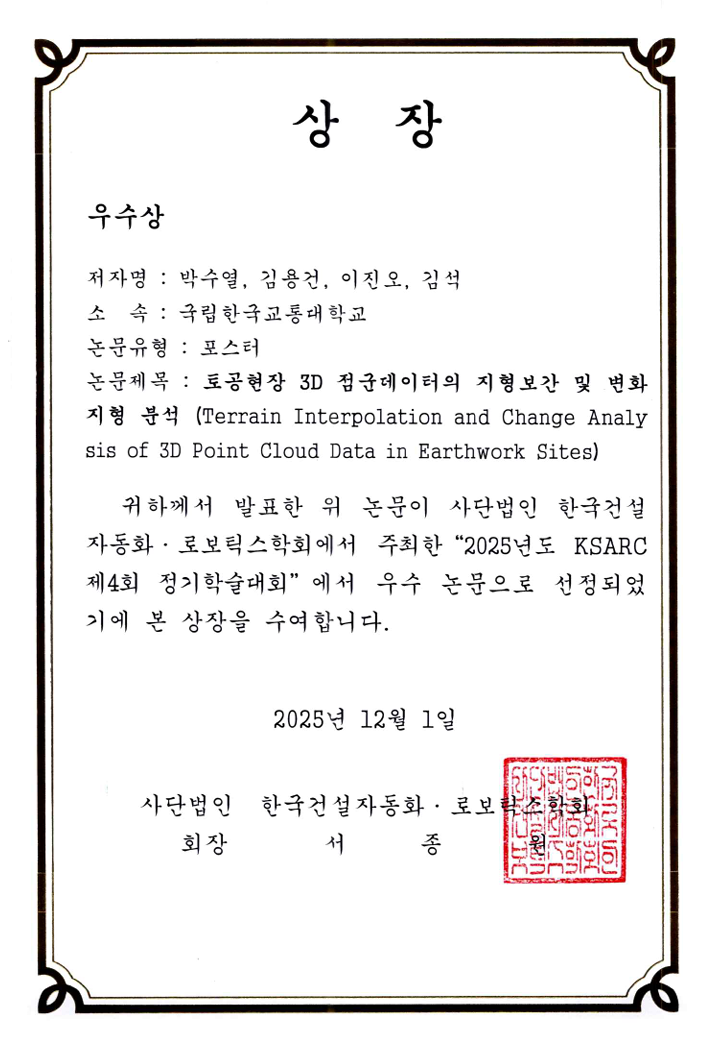 철도건설관리연구실은 2025 건설자동화.로보틱스학회 학술대회에서 우수논문상을 수상했습니다!