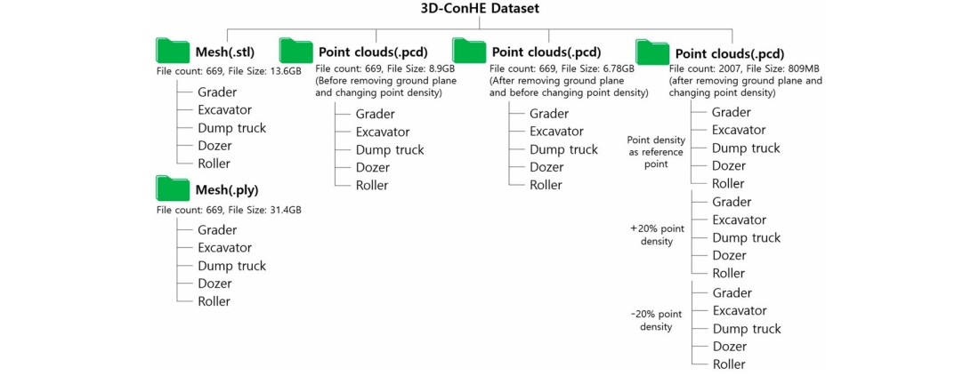 The 3D-ConHE Dataset provides data for five types of construction heavy equipment in the form of 3D Mesh STL and PLY formats, as well as in the file format of 3D PCD. Additionally, the 3D-ConHE Dataset offers both modified and unmodified versions of 3D PCD files, which include construction heavy equipment point cloud data with and without the removal of ground points prior to point density adjustment ('Before Ground Removal & Before Point Density Adjustment', ‘After Ground Removal & Before Point Density Adjustment', ‘'After Ground Removal & After Point Density Adjustment’)." The 3D PCD with the ground removed is structured with three levels of point density: 'Point Density as Reference Point', '+20% Point Density of Reference Point', and '-20% Point Density of Reference Point'."