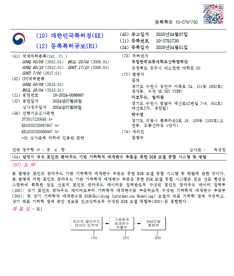 특허등록(포인트 클라우드 기반 기하학적 매개변수 추출을 통한 BIM 모델 통합 시스템 및 방법)
